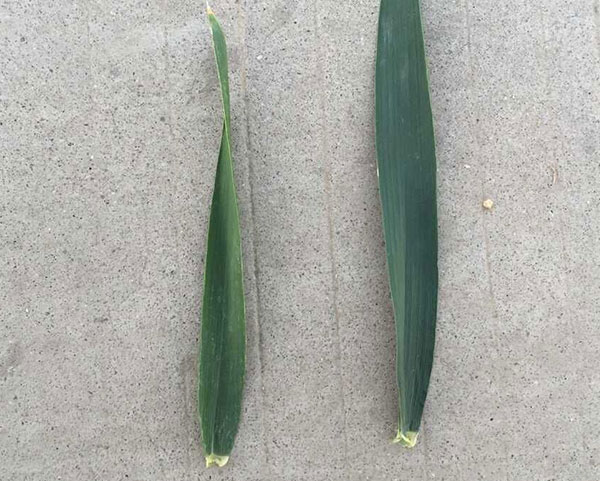 喷施沃丰隆植物疫苗的叶片大厚且黑绿(右)