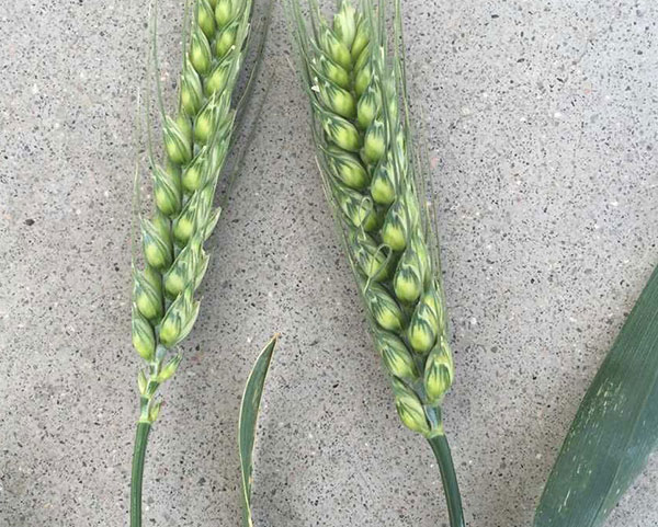 喷施沃丰隆植物疫苗的穗大饱满无虚粒(右)